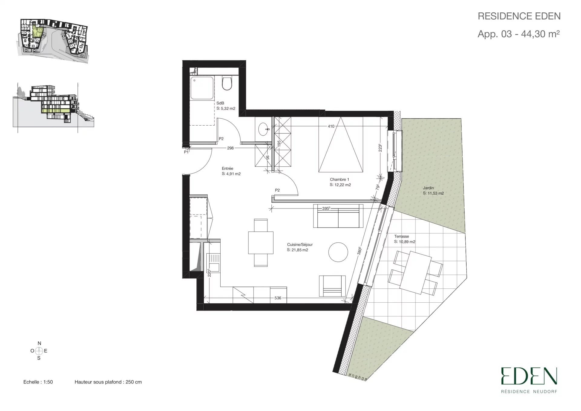 Cet appartement, situé au 1er étage, dispose d’une surface de 44m² et comprend une cave privative, une place de parking intérieure, un jardin de 4m² ainsi qu'une terrasse de 11m².