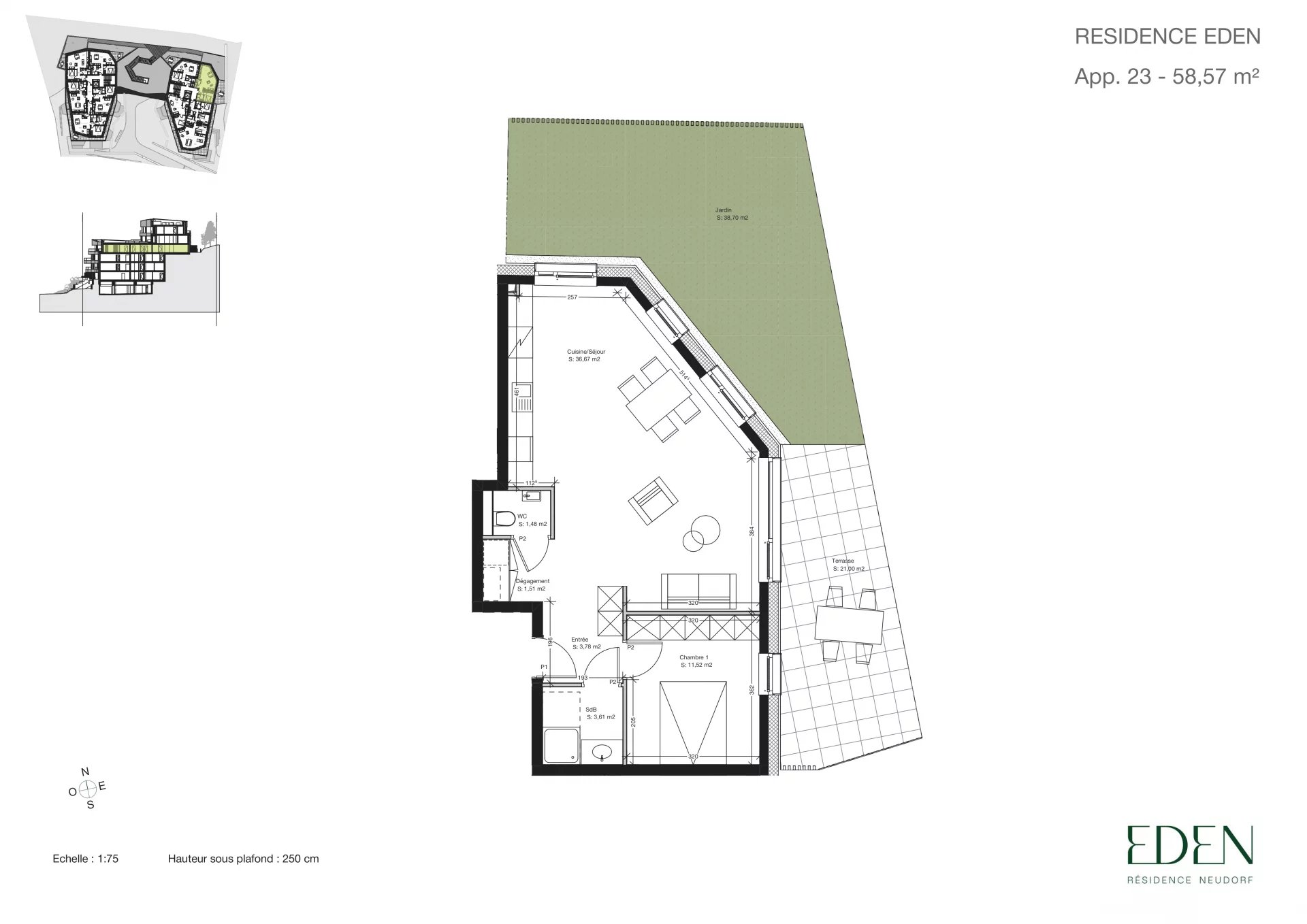 Cet appartement, situé au 4ème étage, dispose d’une surface de 60m² et comprend une cave privative, une place de parking intérieure, un jardin d’une surface de 40m² ainsi qu'une terrasse de 21m².