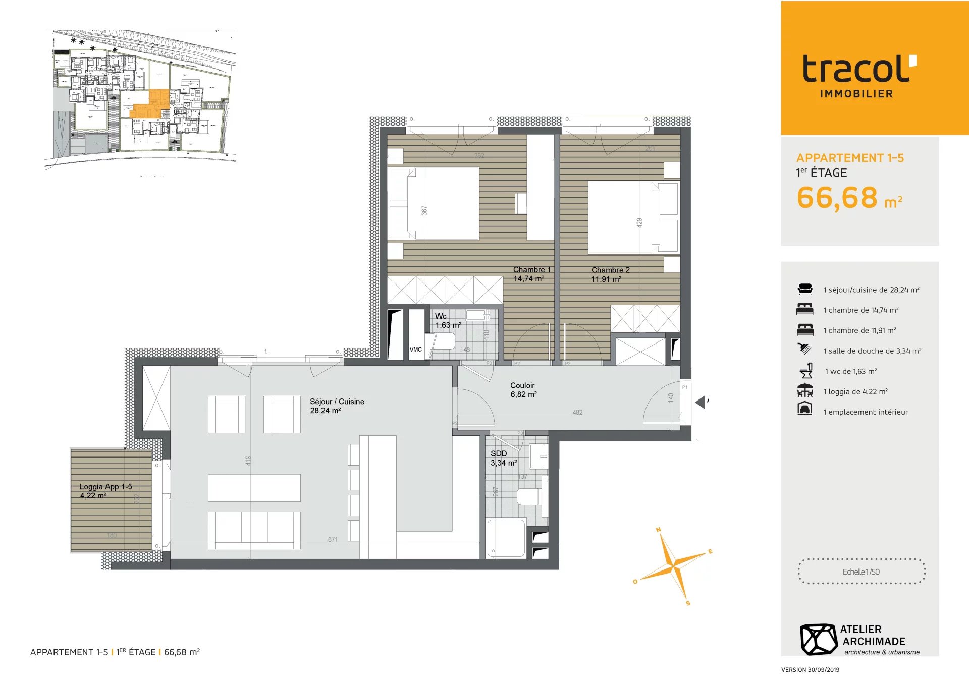 Il est accompagné de 2 emplacements intérieurs et d'une cave.