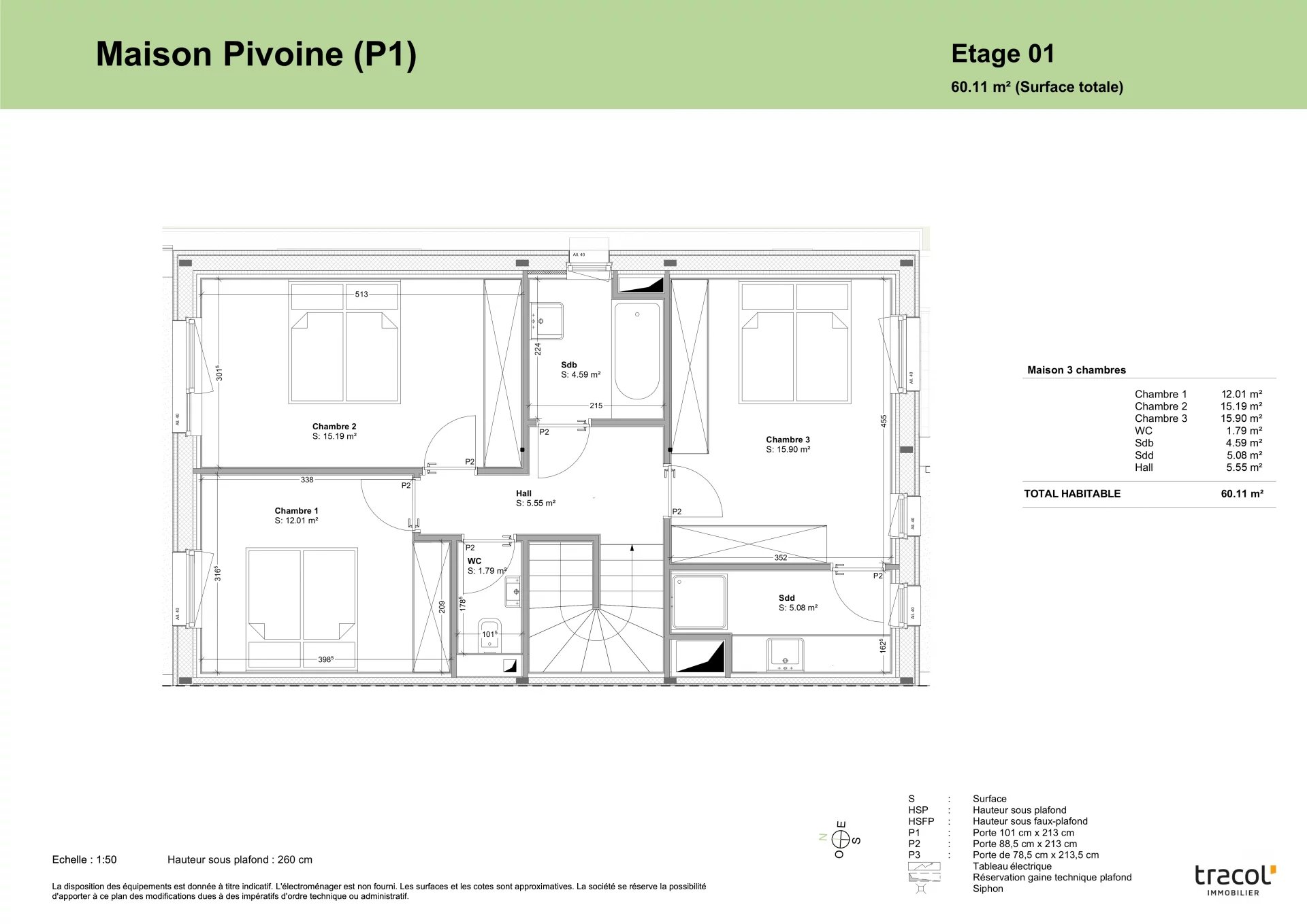 Sur deux étages, la maison, d'une surface habitable de 135,37 m2 (surface totale intérieure : 153,06 m2), se présente comme suit :