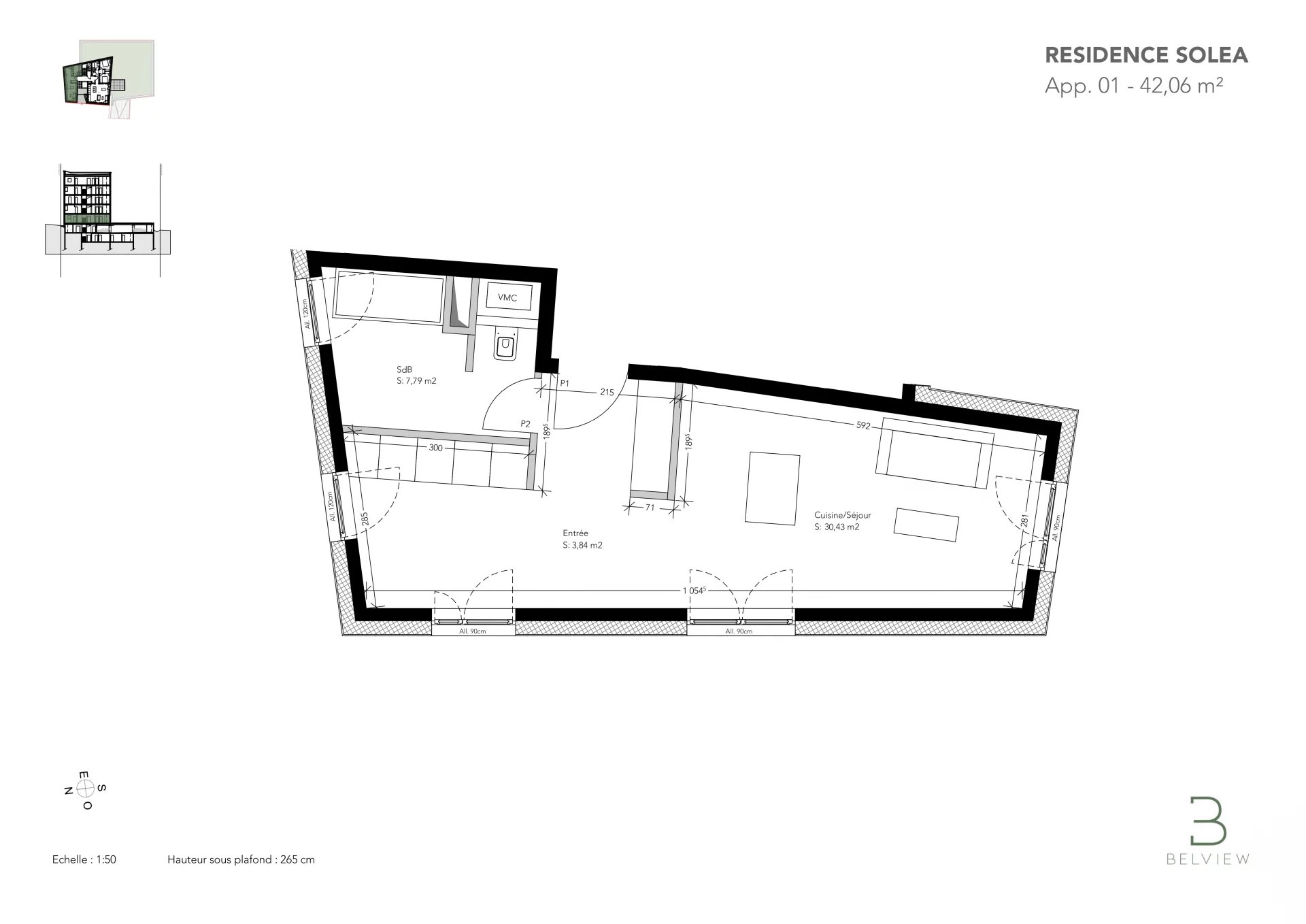 Cet appartement, situé au 1er étage, comprend une entrée (3.84m²), une pièce de vie (30.43m²) composée d’un séjour et d’une cuisine, ainsi qu’une salle de bains (7.79m²) comprenant un WC.