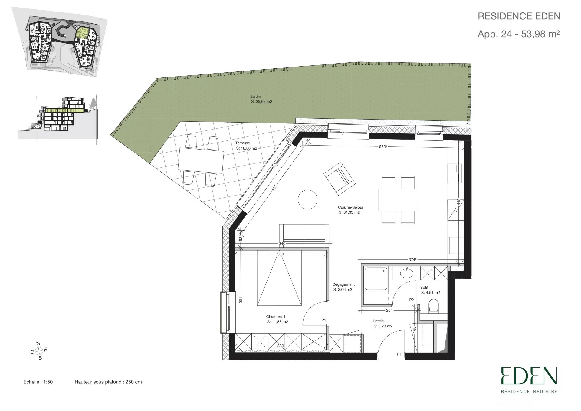 Cet appartement, situé au 4ème étage, dispose d’une surface de 54m² et comprend une cave privative, une place de parking intérieure, un jardin d’une surface de 25m² ainsi qu'une terrasse de 11m².